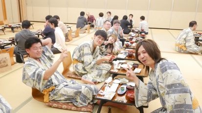 夜は温泉旅館でまったり。料理、温泉、お酒と宴会企画、皆さん楽しんでいただけたご様子。